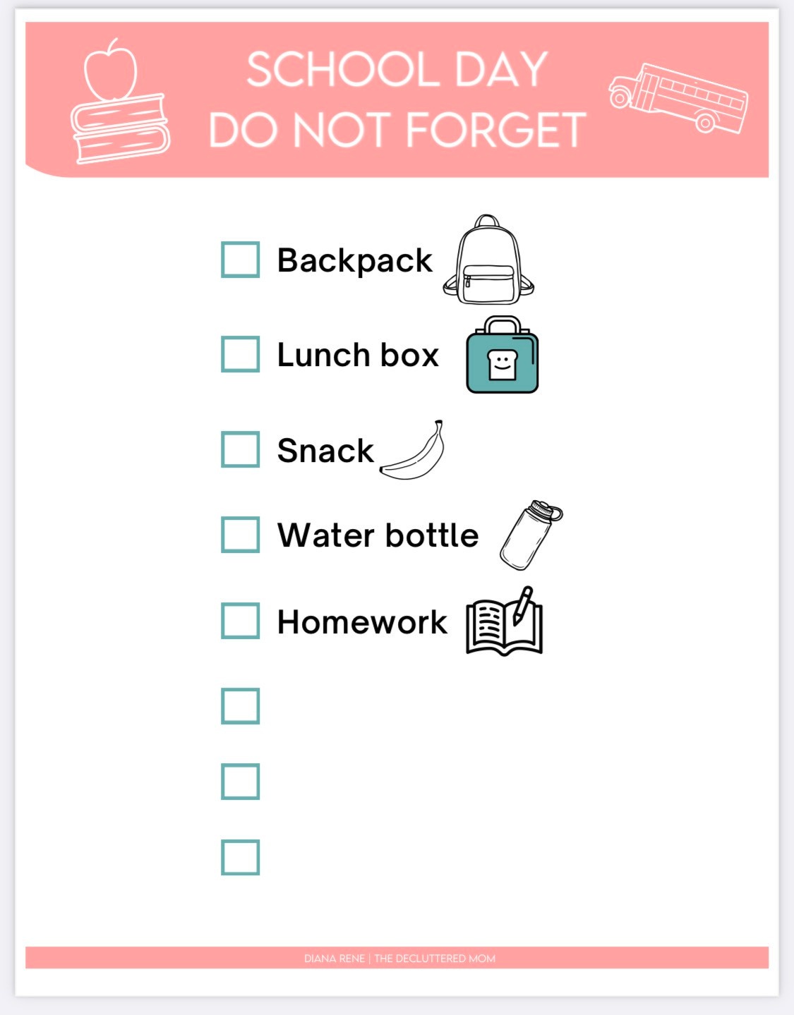 Below is a "do not forget" checklist - and while it has the check boxes, I don't actually check the boxes each day. Instead, it's laminated and hung on the wall in the control center - and I read it out loud right before we walk out the door: