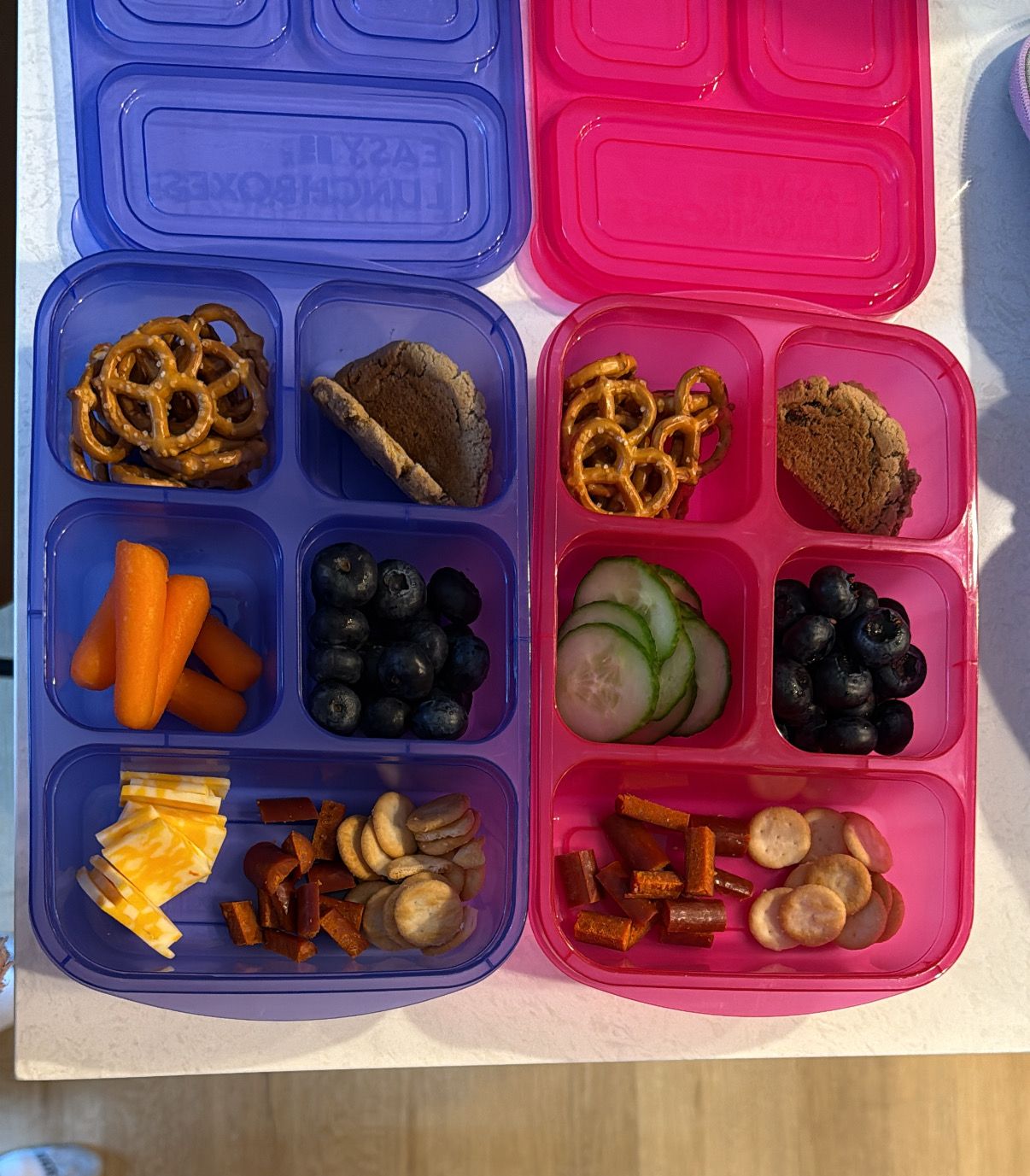 These snack boxes with two sides are from Sistema have been a staple for a long time in our home and they hold up great, and easy to open. (dishwasher safe!) affiliate link