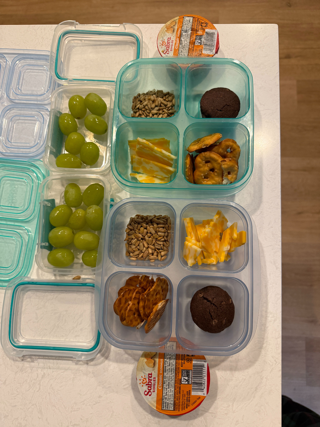 The snack box with the grapes is from Rubbermaid. We haven't used these enough yet to know if I'd recommend them, so not linking them here.
