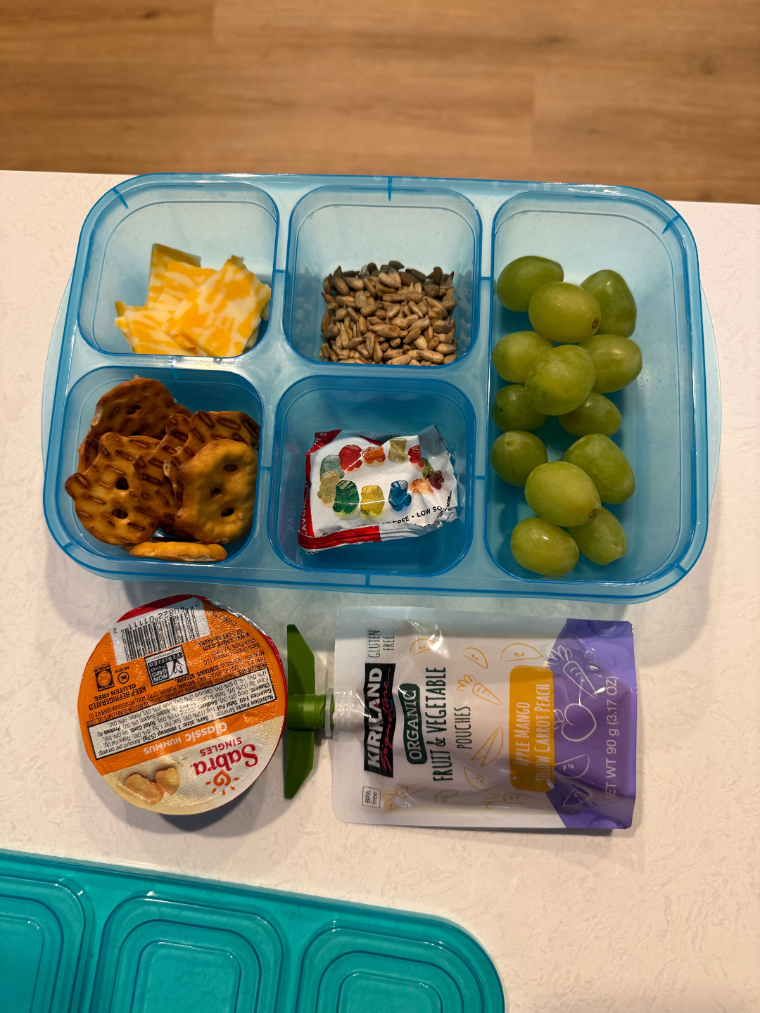 Gluten Free Pretzel Crisps & Hummus, Colby Jack Cheese, Sunflower Seeds, Grapes, Kirkland Fruit/Veggie Pouch, and Gummy Bears to celebrate expanders coming off! 🎉