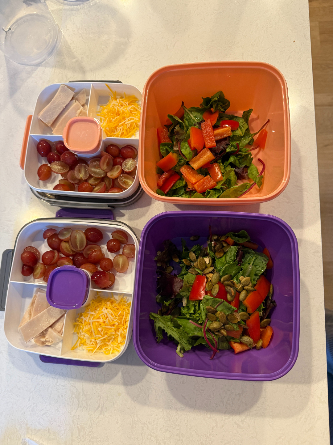 Salad: Mixed Greens, Bell Peppers, Pumpkin Seeds, Chopped Deli Turkey, Shredded Cheese, Dressing (in small containers). One is ranch and one is Italian.