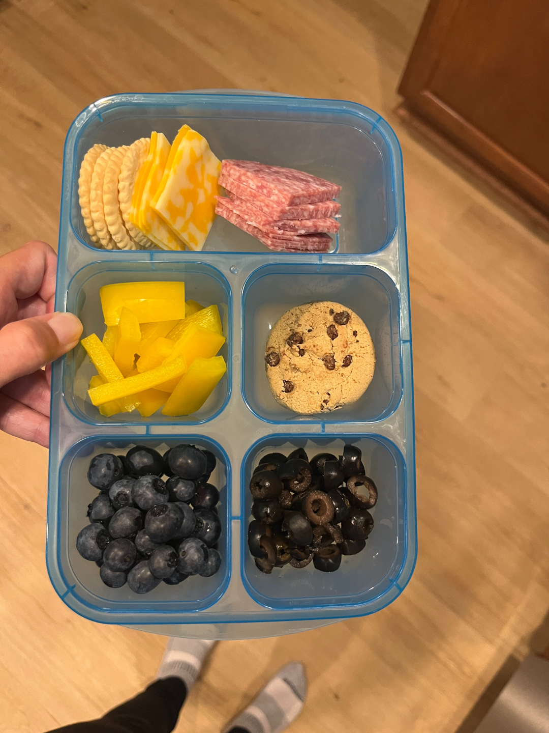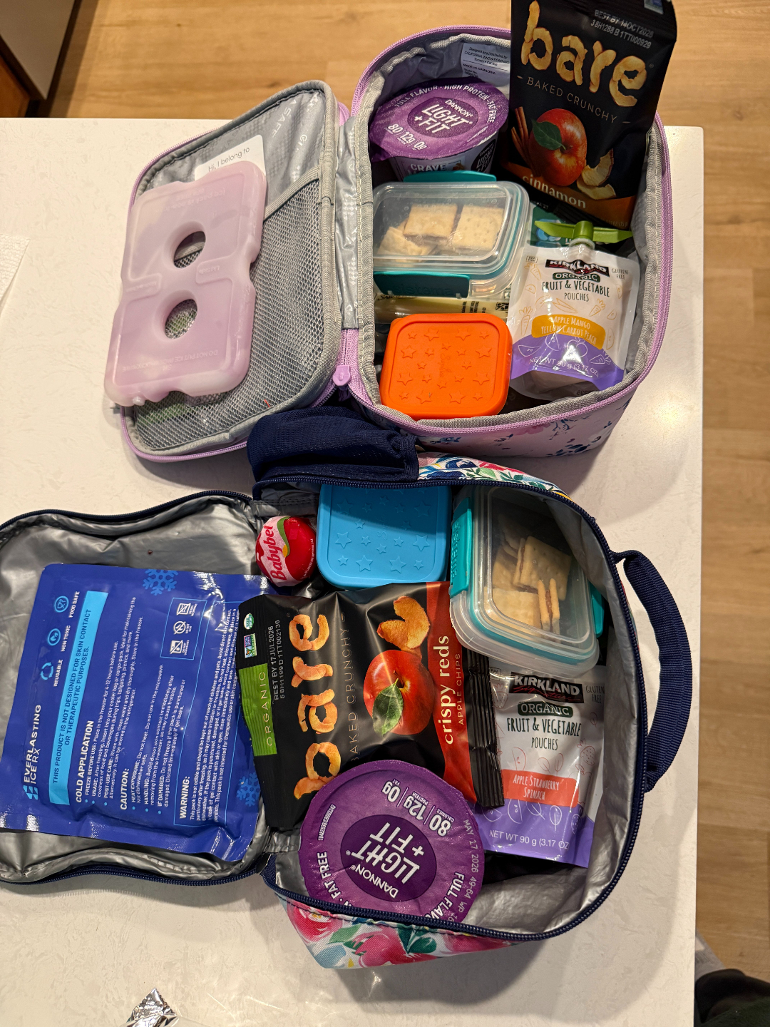 Gluten Free Crackers with Wowbutter sandwiches, Yogurt, Oat Haus Granola, Kirkland fruit/veggie pouch, Babybell cheese and Bare Apple Chips.