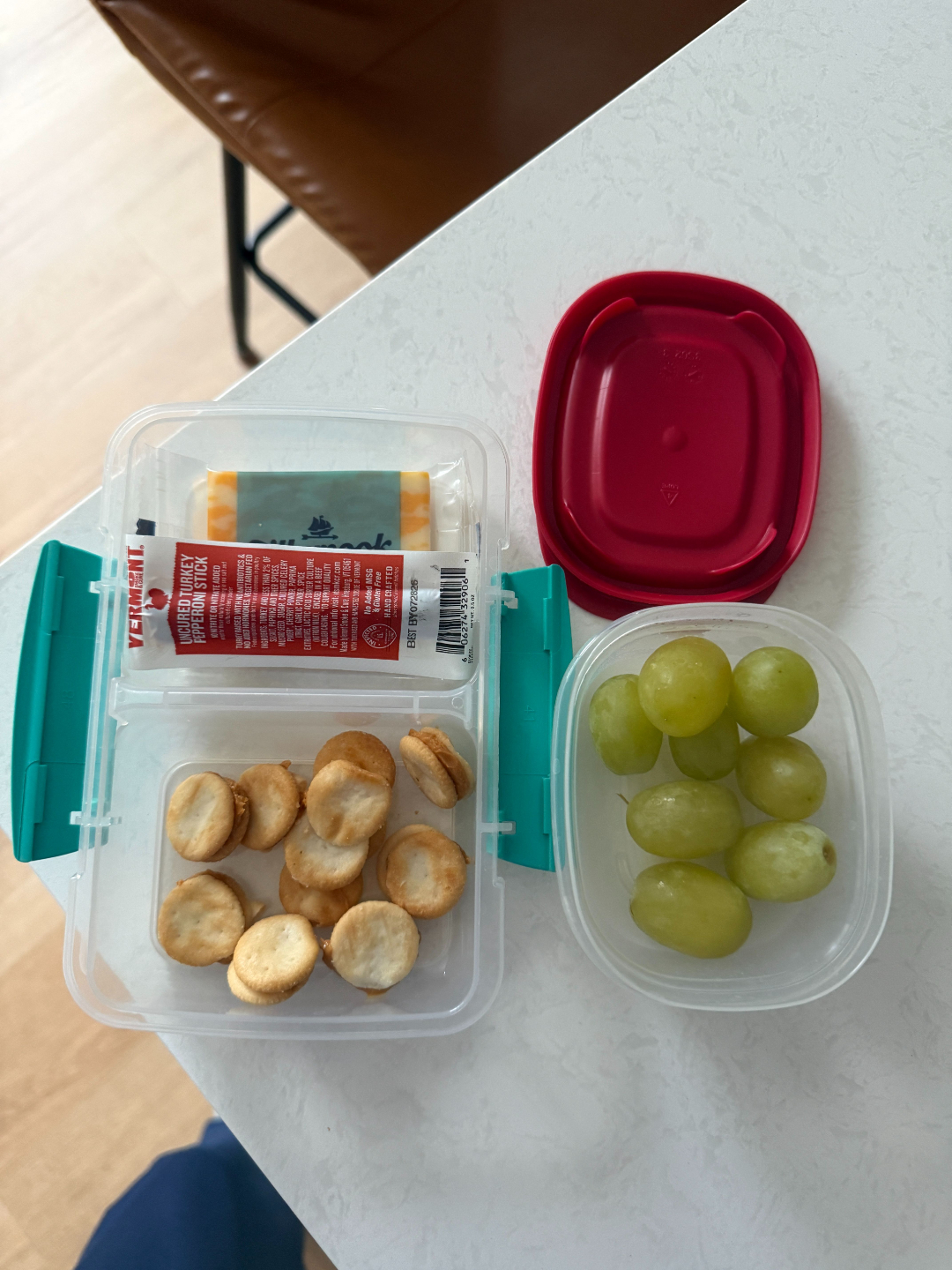 Vermont Turkey Stick, Colby Jack Cheese, Fit Joy Cracker sandwiches with Wowbutter (nut-free spread), Grapes